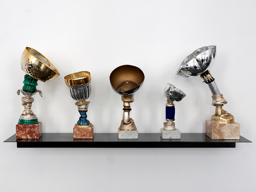 Cette exposition a été imaginée en souvenir de « The trophy series », une série de 5 « combine sculptures » réalisées par Robert Rauschenberg entre 1959 et 1962 dont l’une fut dédiée à Teeny et Marcel Duchamp. Reprenant la poétique de l’artiste américain, « Trophées/Trop faits » invente des relations entre les différentes œuvres qui font appel à l’énigme, à la déduction autant au coq à l’âne qu’à analogie. Le trophée c’est l’étrange bâton du tambour-major qui servait à donner la mesure et rythmer la cadence. Le caractère solennel des Jeux Olympiques et Paralympiques de 2024 ne doit pas empêcher l’humour. La proposition du MAC VAL « taquine » une belle utopie qui fête, en 2024, son centenaire et colore ainsi cette édition des Jeux d’une aura singulière.